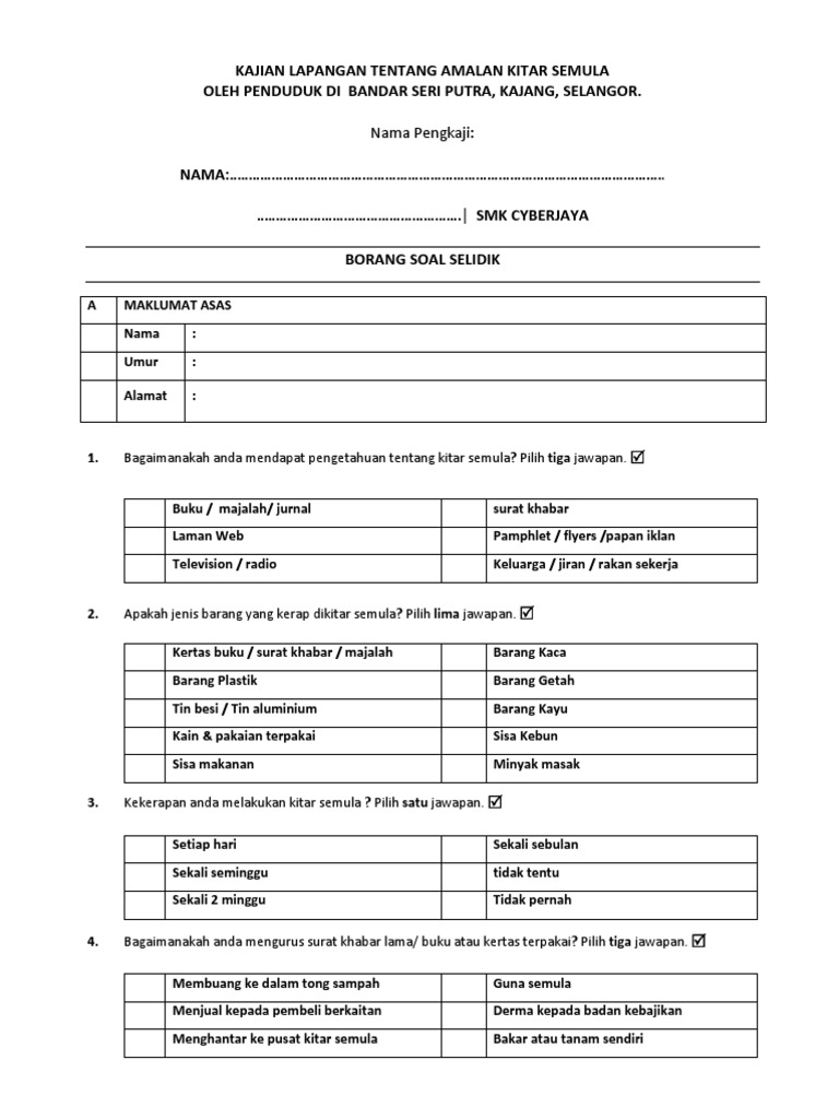 Contoh Karangan Bahasa Malaysia Kandungan Kebaikan Amalan Kitar Semula Mengurangkan pencemaran alam sekitar Mengurangkan kos operasi pelupusan sampah Kemusnahan sumber. Contoh borang soal selidik geografi 2022 tingkatan 3.